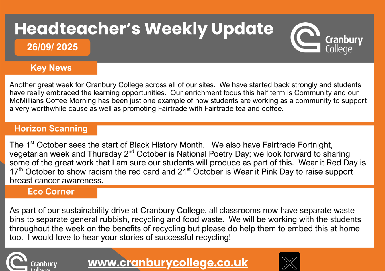 29th September 2025. The latest update from our Headteacher, Mrs Willmott.