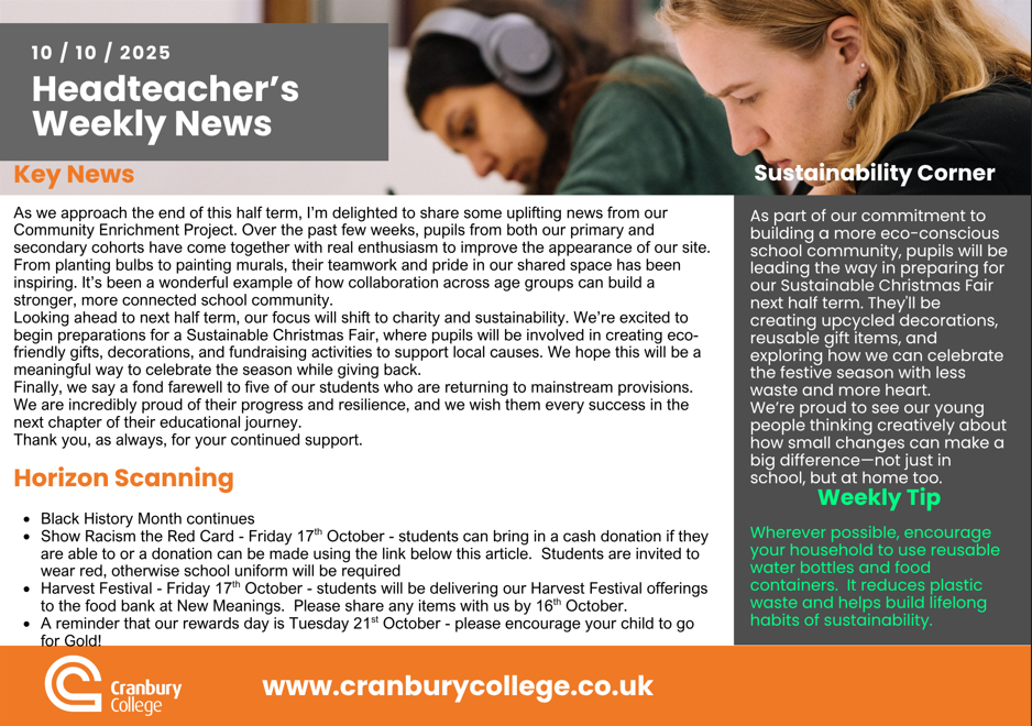 13th October 2025. The latest update from our Headteacher, Mrs Willmott.